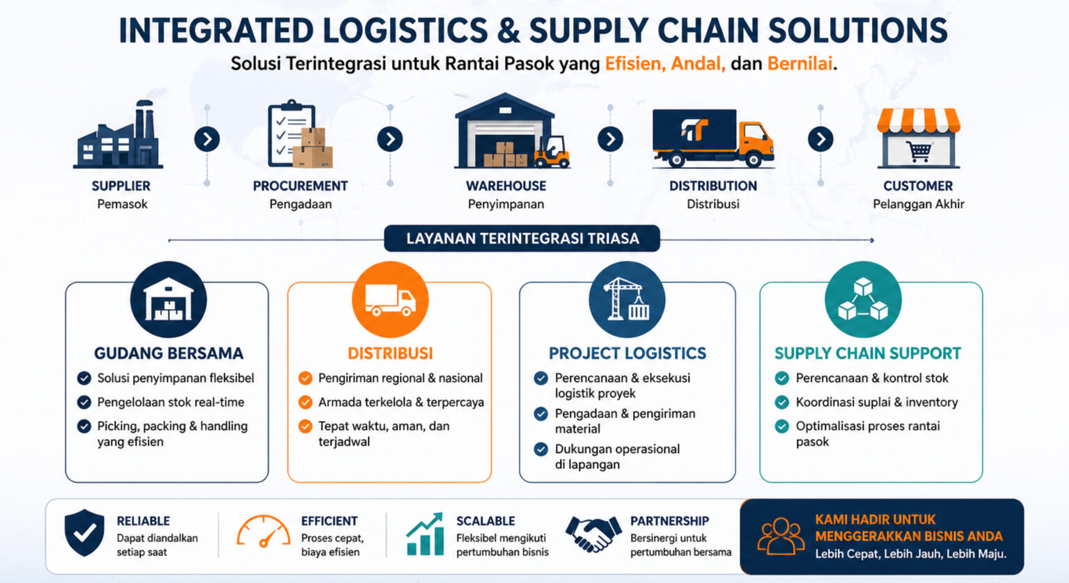Layanan pendukung rantai pasok untuk meningkatkan efisiensi aliran barang dari pemasok ke pelanggan. Mencakup kontrol stok, koordinasi suplai, dan optimalisasi proses operasional.